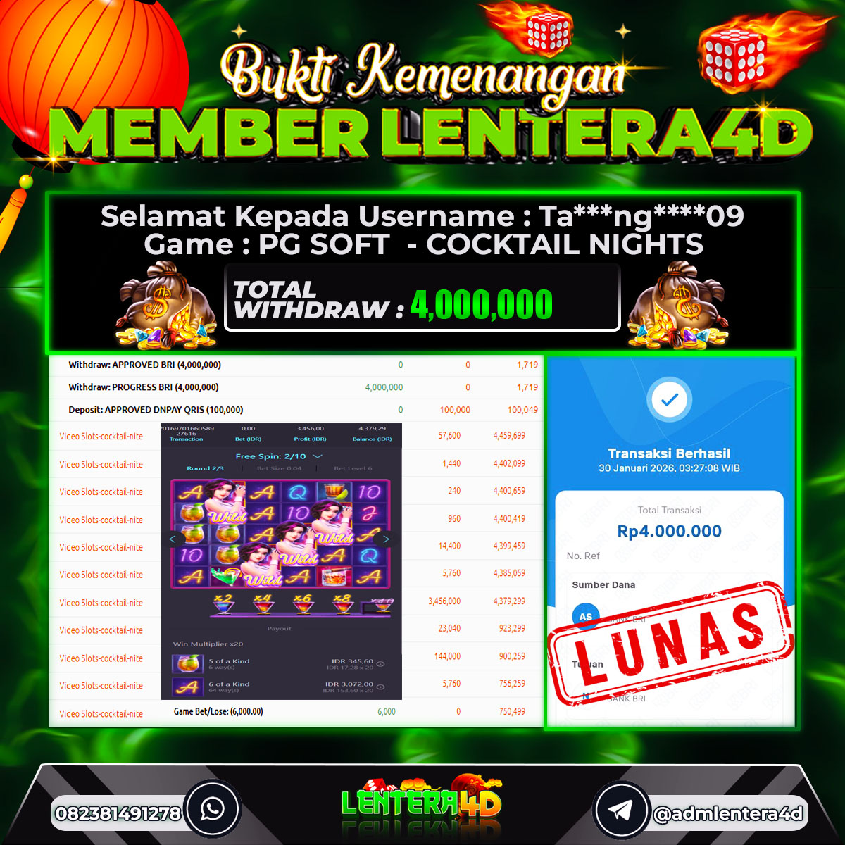 JACKPOT MAIN COCKTAIL NIGHTS 30 JANUARI 2026, Jackpot Slot Gacor, Kemenangan Slot, Bukti Kemenangan Slot, Kemenangan Slot PG SOFT, Menang Slot online, Slot Gacor, Situs Aman Terpercaya, WD Berapapun Pasti DI Bayar Tuntas, Maxwin Slot Online.