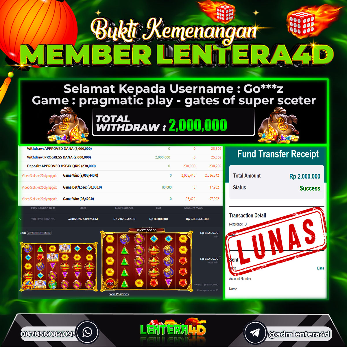 Setiap hari, member Lentera4D berhasil meraih jackpot besar dari berbagai provider slot ternama yang kami sediakan, seperti Pragmatic Play, Habanero, PG Soft, dan masih banyak lagi. Kami secara rutin menampilkan bukti screenshot atau rekapan kemenangan yang berhasil diraih, mulai dari kemenangan ratusan ribu hingga puluhan juta rupiah. Semua slip kemenangan ini kami hadirkan untuk membuktikan bahwa di Lentera4D, peluang menang itu nyata.