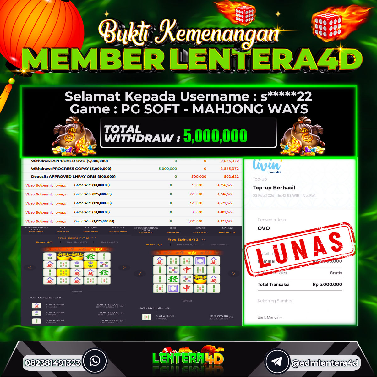 Satu lagi Bukti JP dan Pembarayan Sah Dan Dapat Dipertanggung Jawabkan, WD Berapapun Pasti Dibayar Lunas Hanya di Situs LENTERA4D. Hati Hati Kepada Pihak Pihak Yang Mengatas namakan Pihak LENTERA4D Untuk Melakukan Penipuan.