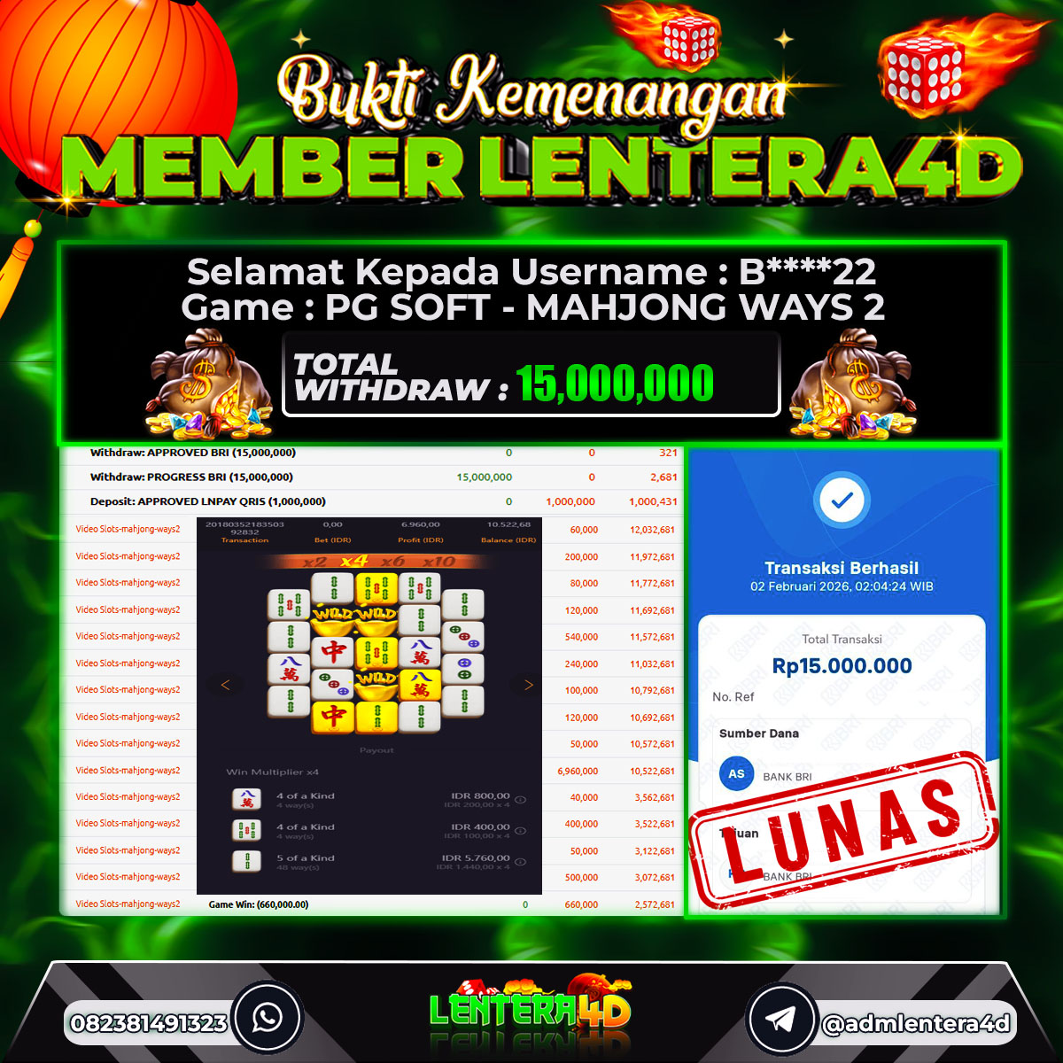 TOTAL KEMENANGAN : Rp. 15.000.000,-