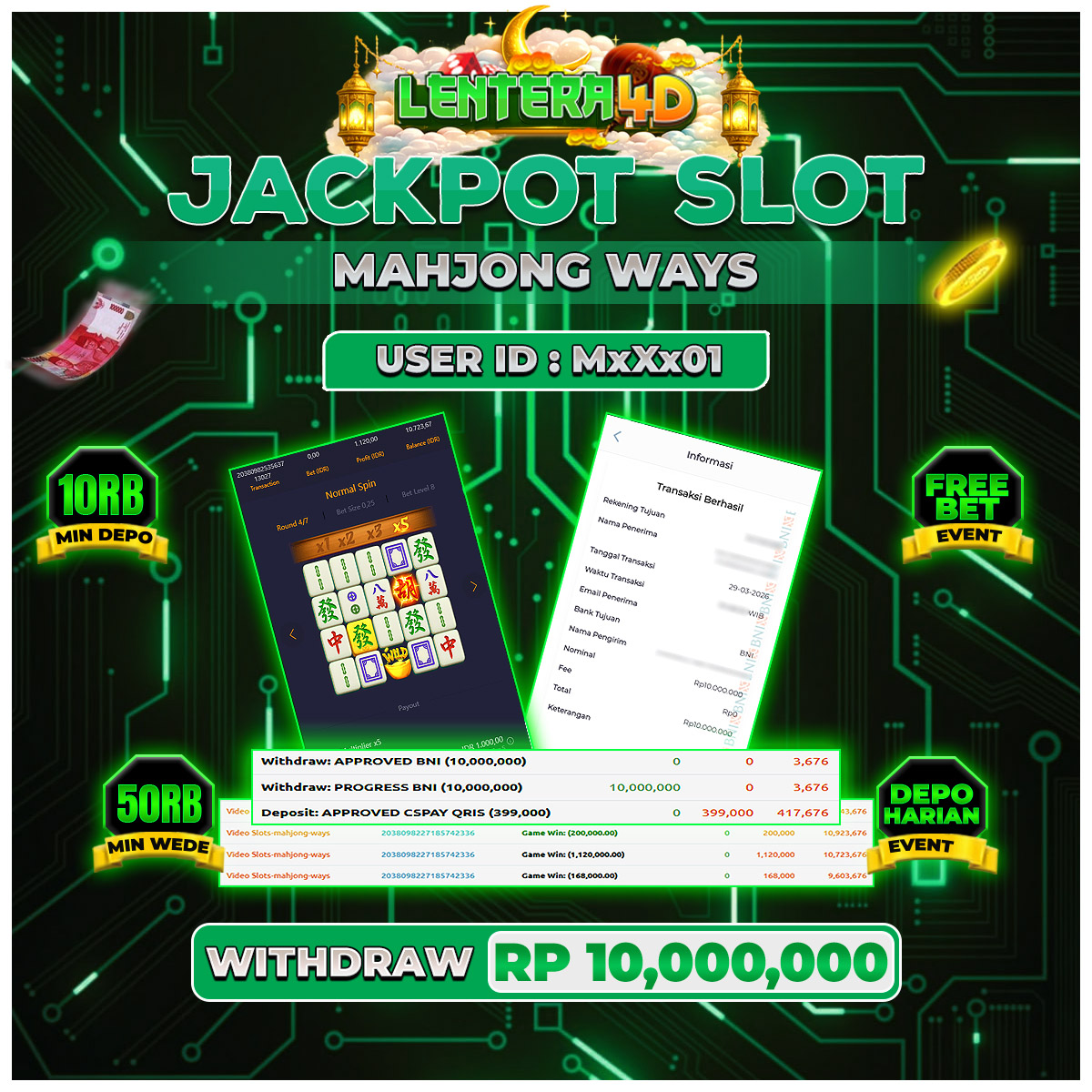 Setiap hari, member Lentera4D berhasil meraih jackpot besar dari berbagai provider slot ternama yang kami sediakan, seperti Pragmatic Play, Habanero, PG Soft, dan masih banyak lagi. Kami secara rutin menampilkan bukti screenshot atau rekapan kemenangan yang berhasil diraih, mulai dari kemenangan ratusan ribu hingga puluhan juta rupiah. Semua slip kemenangan ini kami hadirkan untuk membuktikan bahwa di Lentera4D, peluang menang itu nyata.