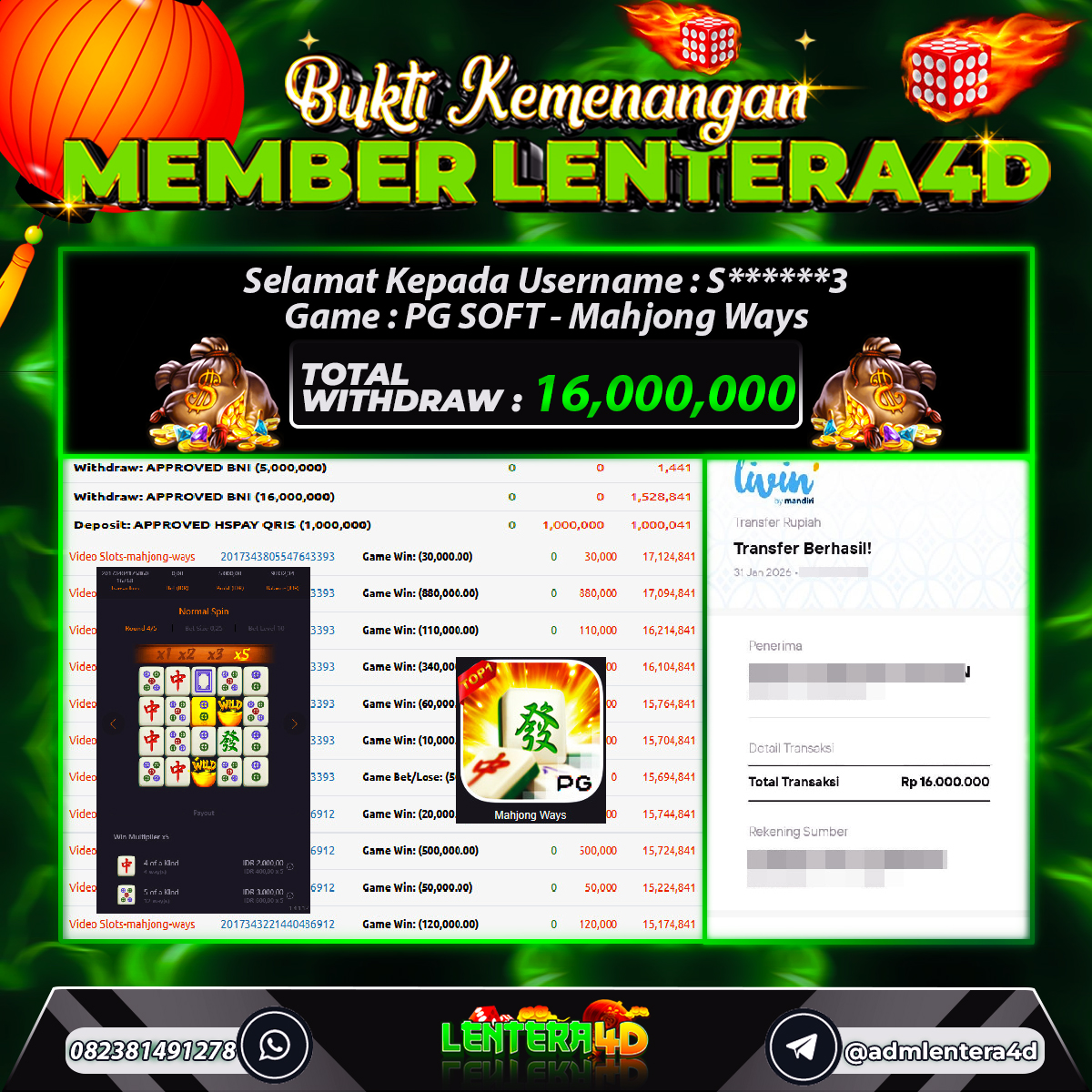 JACKPOT MAIN MAHJONG WAYS 31 JANUARI 2026, Jackpot Slot Gacor, Kemenangan Slot, Bukti Kemenangan Slot, Kemenangan Slot PG SOFT, Menang Slot online, Slot Gacor, Situs Aman Terpercaya, WD Berapapun Pasti DI Bayar Tuntas, Maxwin Slot Online.