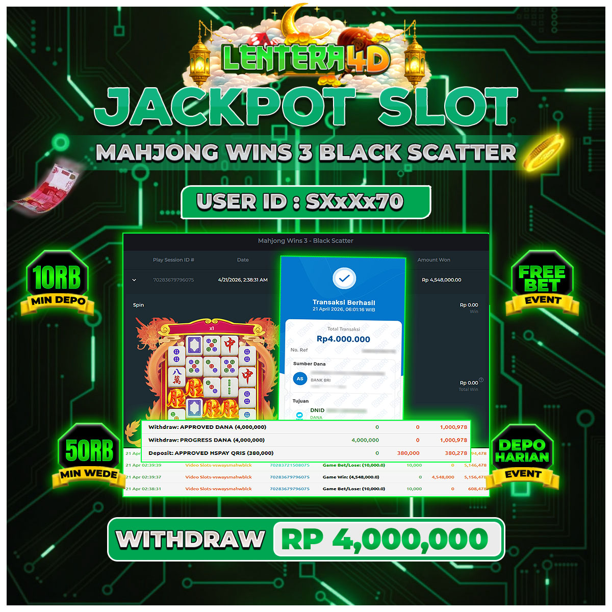 Lentera4D dikenal sebagai situs terpercaya yang selalu menghadirkan pengalaman bermain slot online yang aman, fair, dan berlisensi resmi. Di sini, kami tidak hanya sekadar memberikan janji, tapi bukti nyata berupa slip kemenangan yang dapat Anda lihat secara langsung.