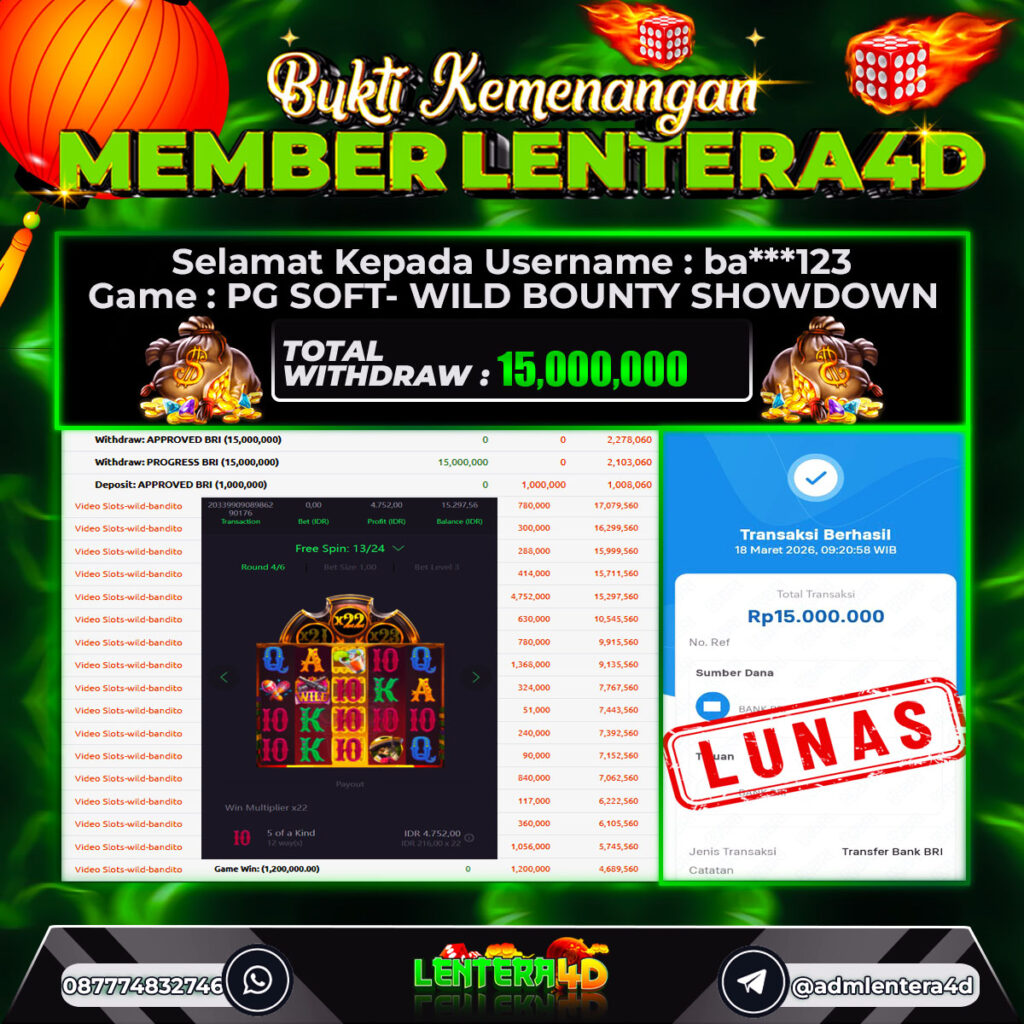 Setiap hari, member Lentera4D berhasil meraih jackpot besar dari berbagai provider slot ternama yang kami sediakan, seperti Pragmatic Play, Habanero, PG Soft, dan masih banyak lagi. Kami secara rutin menampilkan bukti screenshot atau rekapan kemenangan yang berhasil diraih, mulai dari kemenangan ratusan ribu hingga puluhan juta rupiah. Semua slip kemenangan ini kami hadirkan untuk membuktikan bahwa di Lentera4D, peluang menang itu nyata.